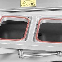 Industrielle Vakuumverpackungsmaschine mit extra großer Kammer für die Verpackung großer Artikel oder für eine maximale Anzahl an Beuteln pro Zyklus. Ausgestattet mit einer leistungsstarken Busch-Vakuumpumpe (300 m³/h), ist sie komplett aus Edelstahl gefertigt und verfügt über eine Doppelkammer zur Minimierung von Ausfallzeiten während des Verpackungsprozesses. Drei verschiedene Schweißbalkenkonfigurationen stehen zur Verfügung.
